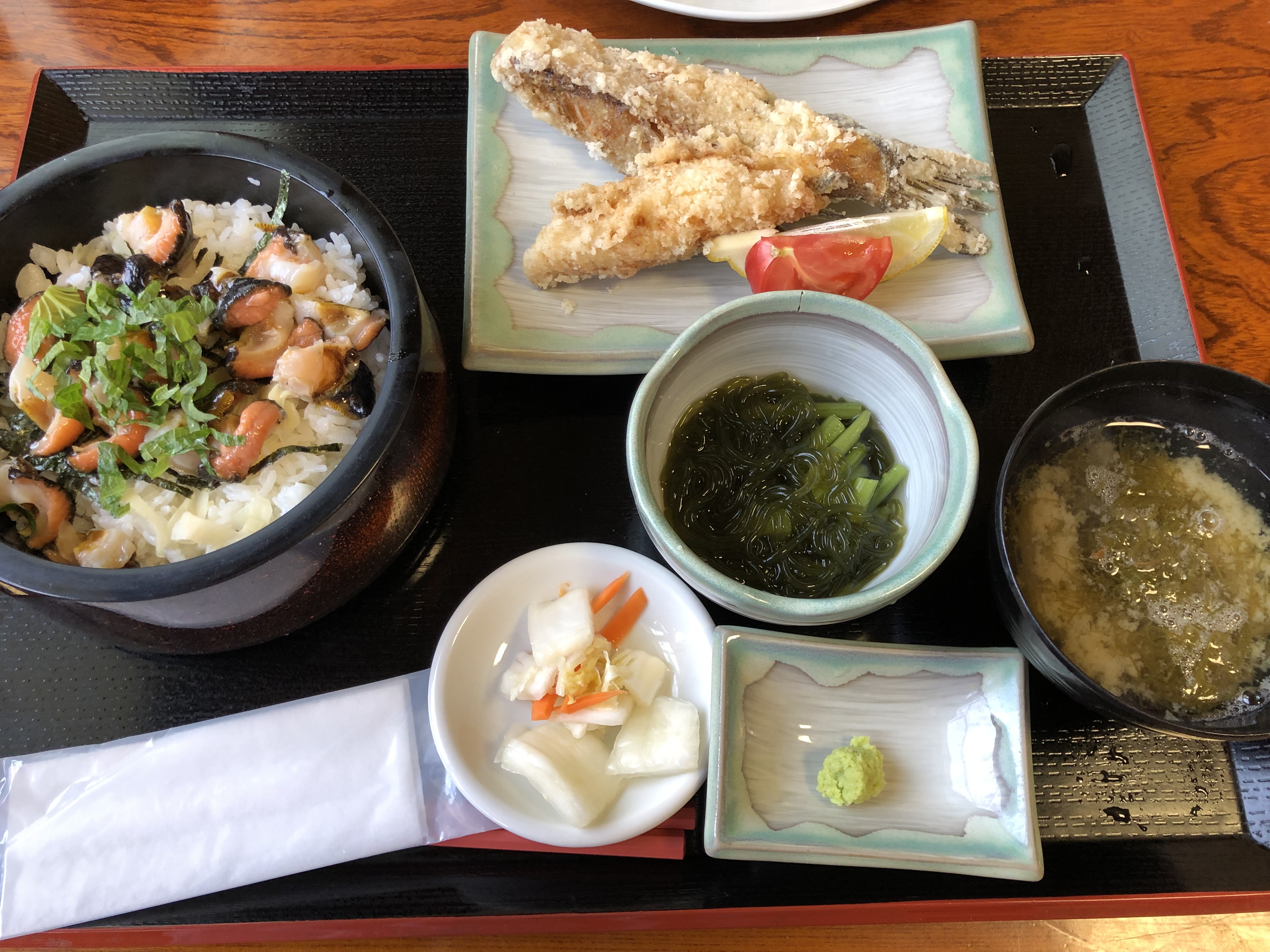 すごいボリューム!さざえちらし、魚の唐揚げ、味噌汁、一品。味噌汁はもずくが入ってて、海の近くにいることを感じられる。一品は「つるつるわかめ」っていう深浦の名物。すごいボリュームなのに、これとは別にお刺身を頼んだのは内緒、、、
