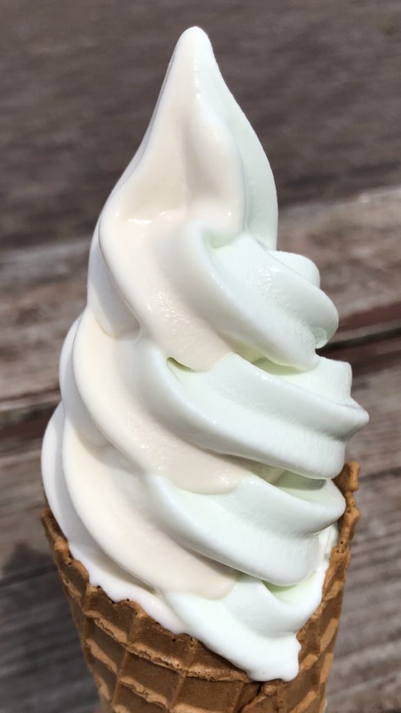 ありましたよ、素敵なソフトクリームが。その名も「ちそうソフト」。左側の茶色い方が味噌、右側の青い方が塩という調味料の基本みたいなソフトクリーム。ちょいしょっぱ香ばしくて美味しい。